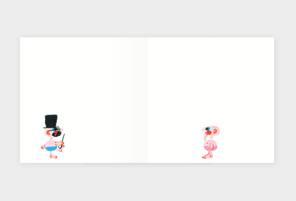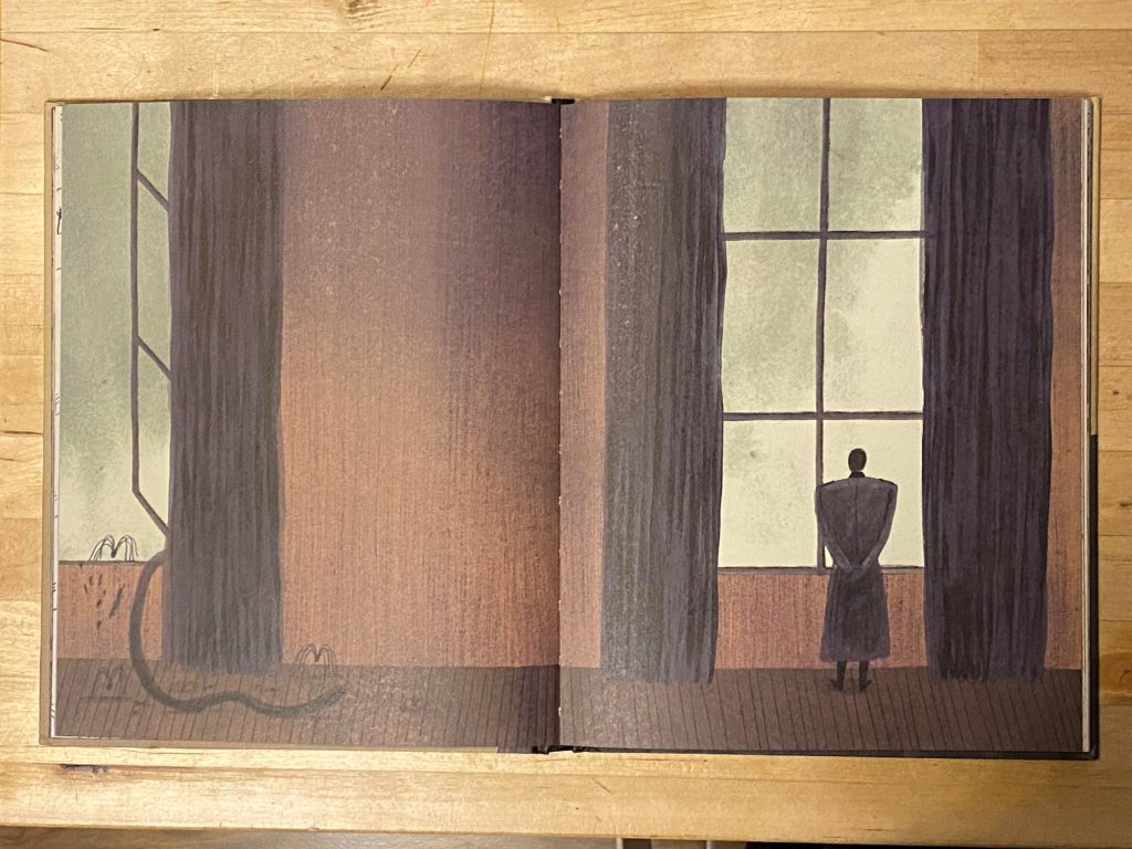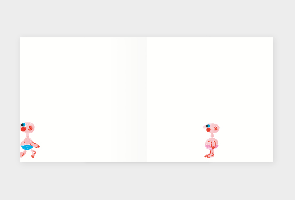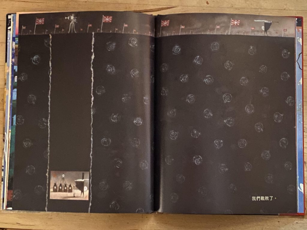 以繪本作為「演出舞台」,《誰贏了?》14頁將人類文明與未來寓示給讀者,用書頁作為中線,一條線隔開成「兩個世界」,劇場感非常強烈。無論《異類》或《誰贏了?》,都在陳述兩種世界觀的對話,在什麼情況下,有一方會成為威脅,在關係決斷、各自表述的情況下,故事走向將會如何。