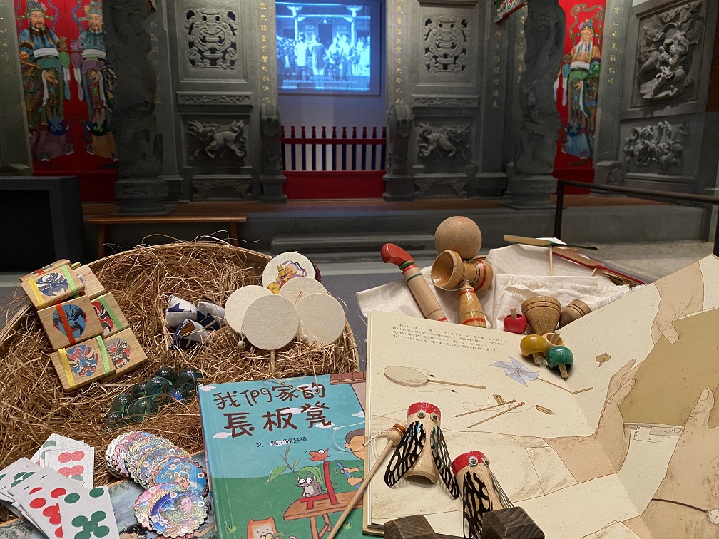 廟口說故事搭配兒童節主題,除了有童玩繪本,還有多樣古早童玩可以一起同樂。