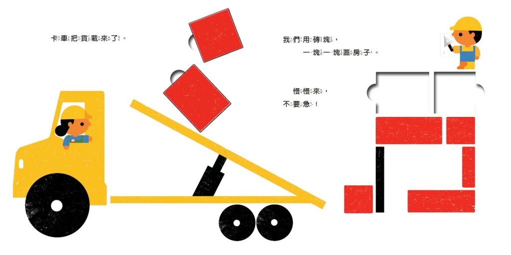 隨著故事的指示,移動書中特殊形狀的圖版,就能幫書中角色戴上安全帽、操作推土機、搬磚頭、蓋屋頂……一步一步蓋好美麗的家!