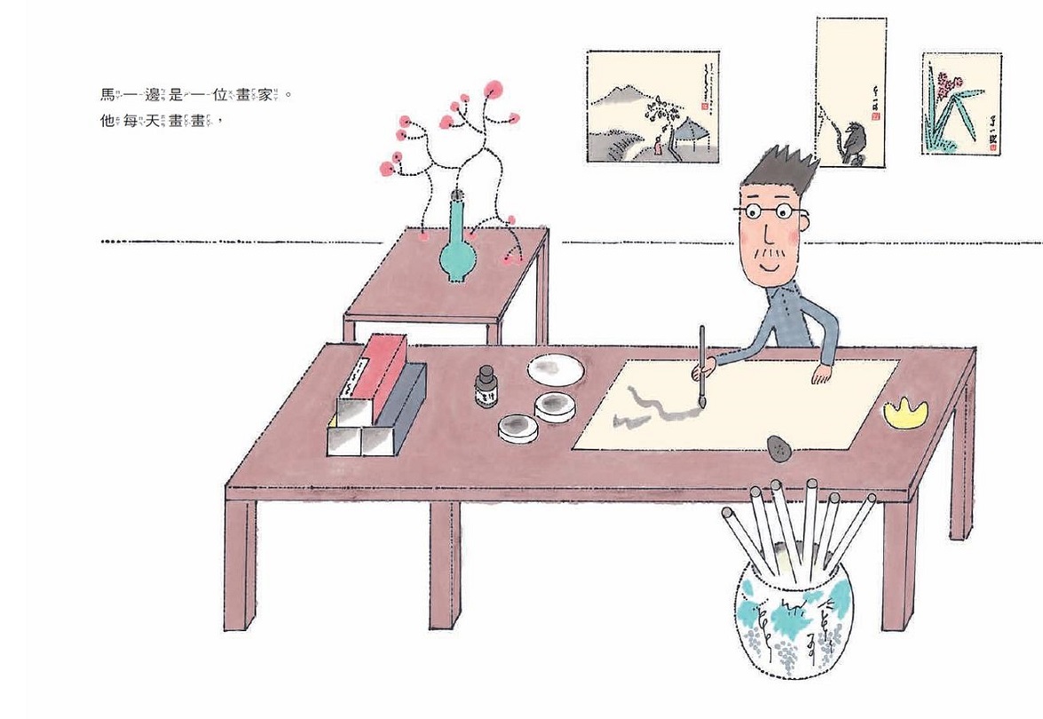 不論是《愛吃水果的牛》、《建築師傑克》、《青蛙大俠江河湖》,還是《下雨了》、《孫小空72變》,都是和孩子們說故事時,容易朗朗上口、廣受喜愛的繪本故事,明亮活潑的用色、特色的繪圖風格,還有幾何圖形的創意運用,湯姆牛每次的新書,都可以看到不同的故事樂趣。《畫家馬一邊》和湯姆牛以往的風格很不一樣,除了一定會有的幾何圖形及角色繪製風格外,更多的是水墨的溫柔抒情,兩種看似不同的畫風,結合起來別有一番獨特。