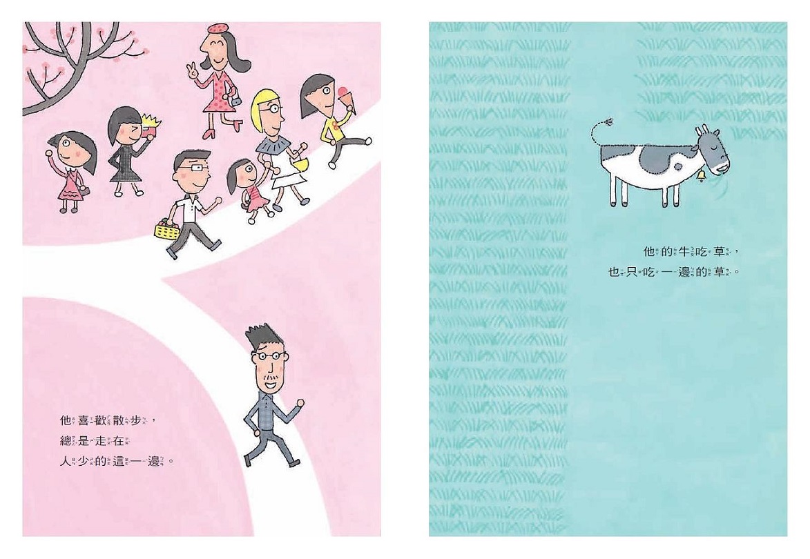 馬一邊是個畫家,而且是個井然有序的畫家,從牆面的掛圖、桌面的擺設、居住的空間,乃至於生活習慣,都有著自己的簡單卻規律的步調。有趣的是,作者運用一整頁的空白,來突顯馬一邊總習慣睡在靠近太陽的這一邊,就連走路及他養的牛,都有自己習慣的某一邊。再來的跨頁帶出他的好朋友──夏冬心,和他居住的位置,一個在山腳一、一個住山頭,各自面向左右兩邊,構圖畫面很平衡、想互對稱,即使兩個人看起來不同,卻是好朋友唷!