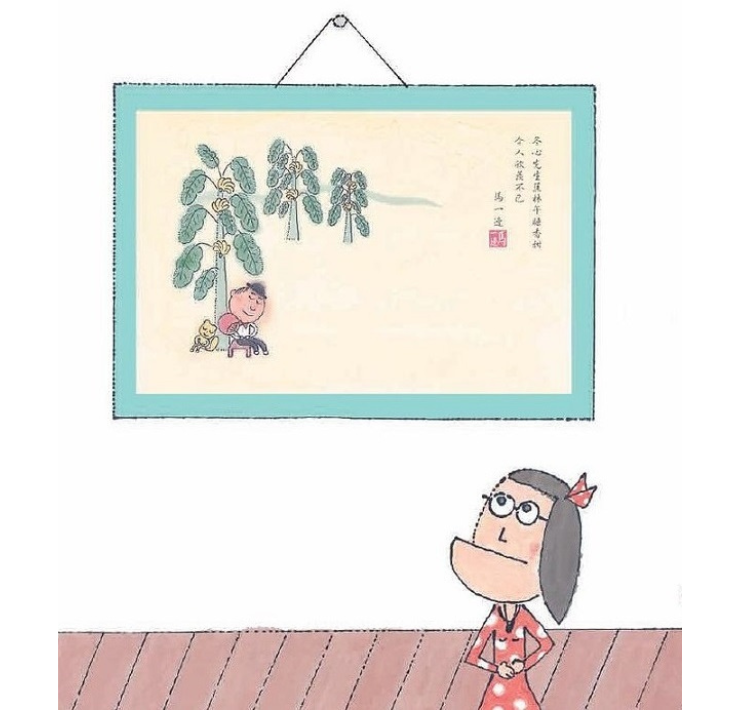 但無論如何,湯姆牛似乎以此表現了一種不為世俗羈絆的自在,運用在故事裡的夏冬心身上,剛好和嚴謹過日子的馬一邊有了對比感,雖是如此,夏冬心還是為馬一邊送他的畫作仔細的裱上青綠色的框,而馬一邊的留白不也是流露了呼應夏冬心閒適的性情?!回顧到他們兩人居住在同一座山頭的跨頁,不免明白,即使看似相異,卻也因相互體貼而相似,這就是朋友啊!