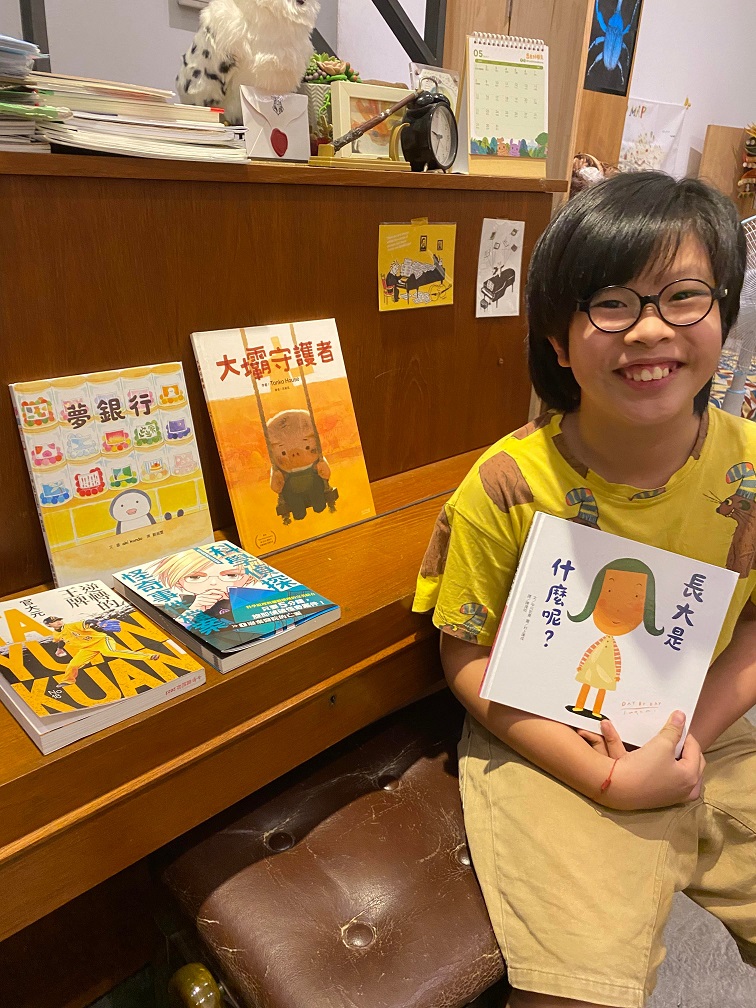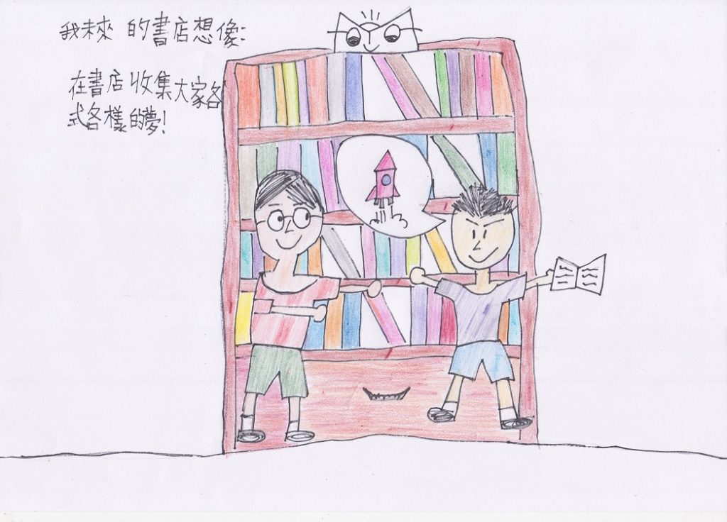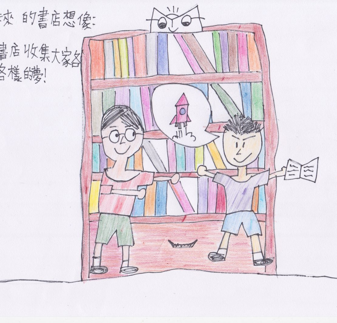其實我對夢想還沒有很確定的想法和計畫,有好多事想做,有好多地方想去,但是有一件我正在努力的事,即使長大了我也想要繼續做,那就是書店的店員工作,我很喜歡在書店裡和大家一起讀書,在書架上發現很多精彩的故事,也發現很多的問題和它們的答案,我喜歡在書店裡認識很多人,也聽他們說他們的生活和夢想,當我和媽媽讀《夢銀行》時,覺得書店也很像夢銀行耶,書架上收藏了各種滋味的夢,有人喜歡飛翔的夢、有人喜歡糖果雨的夢、也有人喜歡恐怖的惡夢,也有人想在夢裡「讀」到思念的人和珍貴的記憶,為大家提供一個做夢的場所是多麼棒的一件事,這就是我對書店工作未來的想像!