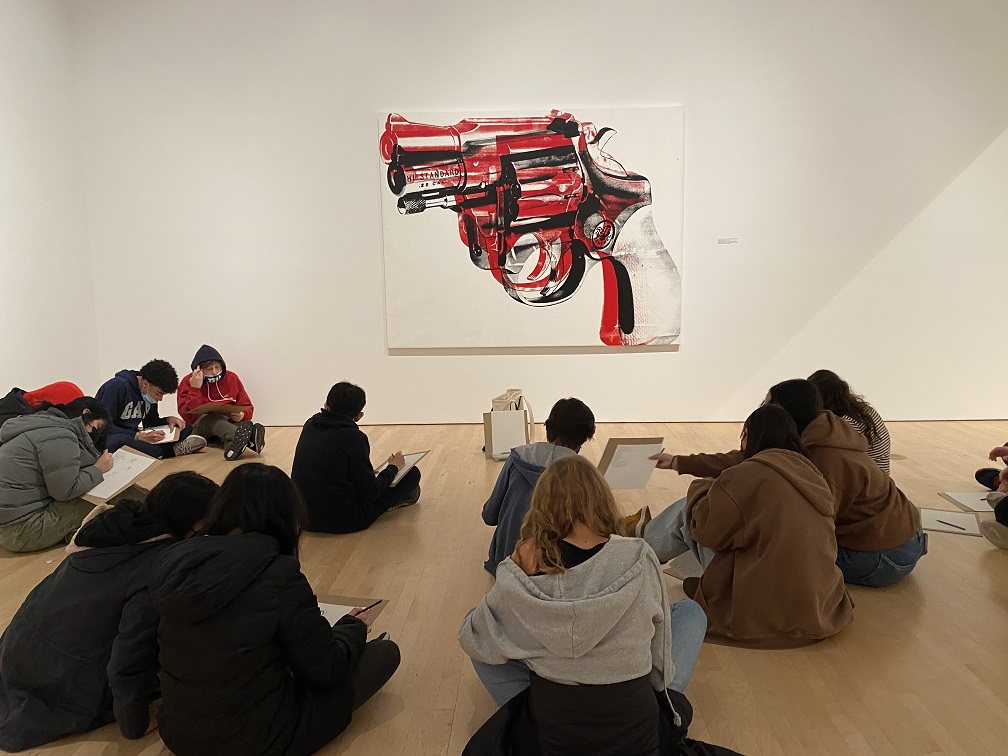 這天和九年級的學生在 Brooklyn Museum 的安迪沃荷(Andy Warhol)特展中探討身份認同。我們從他的自畫像和媽媽的肖像畫開始,再到與尚·米榭·巴斯奇亞(Jean-Michel Basquiat)合作的拳擊沙包,最後以槍枝畫系列作結,我們從顏色、表情、象徵符號拼湊他身分認同的蛛絲馬跡,再回到自己。