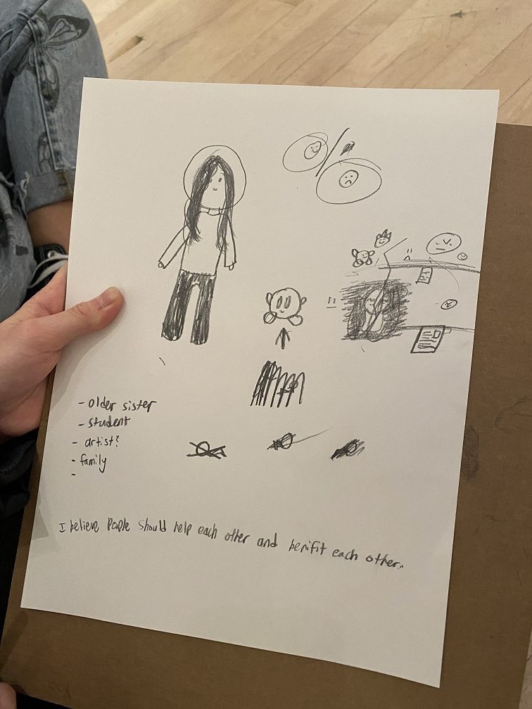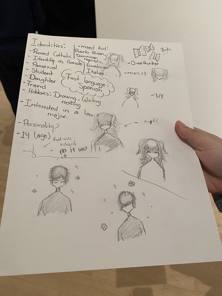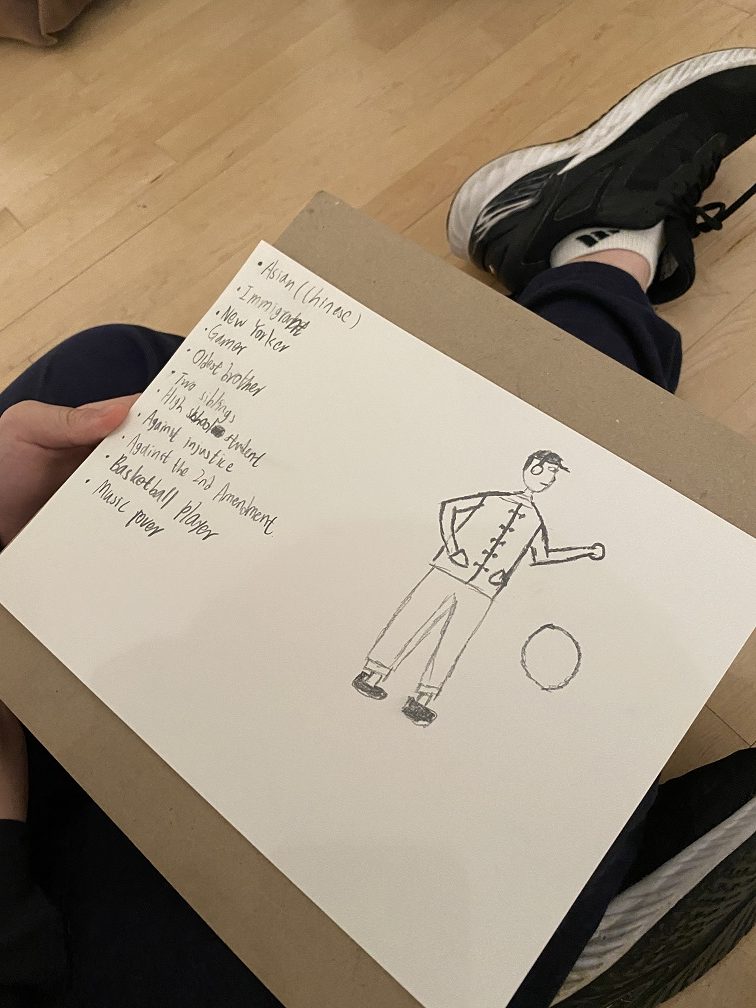 前面提到面對信仰感到很糾結的學生畫了一個充滿裂痕的十字架;有人畫自己戴著耳機正在運球,寫下自己的各種身份認同,包含中國移民、高中生、反對持槍權(美國憲法第二修正案);也有畫自己在不同的情境裡的樣子,一旁寫著混血(波多黎各、多明尼加、厄瓜多、義大利)、泛性戀者、自己的第一語言是西班牙文、喔,還有容易想太多。