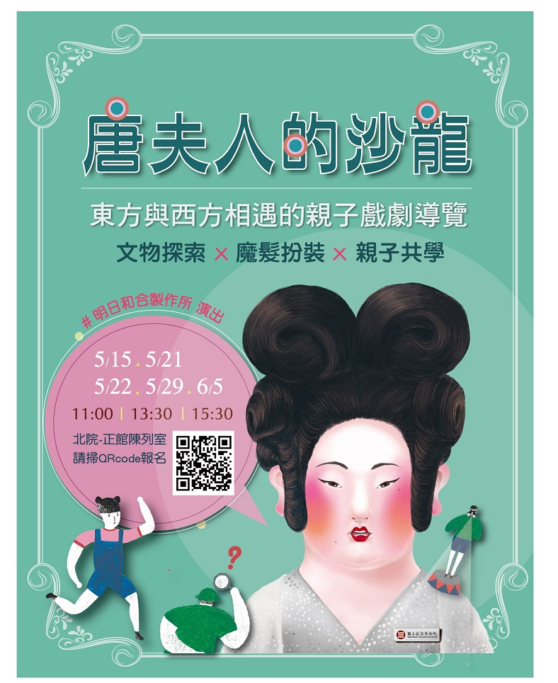 「唐夫人的沙龍」親子戲劇導覽,由新銳跨界展演團隊「明日和合製作所」,以互動式戲劇導覽串連故宮展廳文物,小朋友還可以體驗有趣的髮型扮裝,歡迎大小朋友來故宮享受美好的親子共學時光!