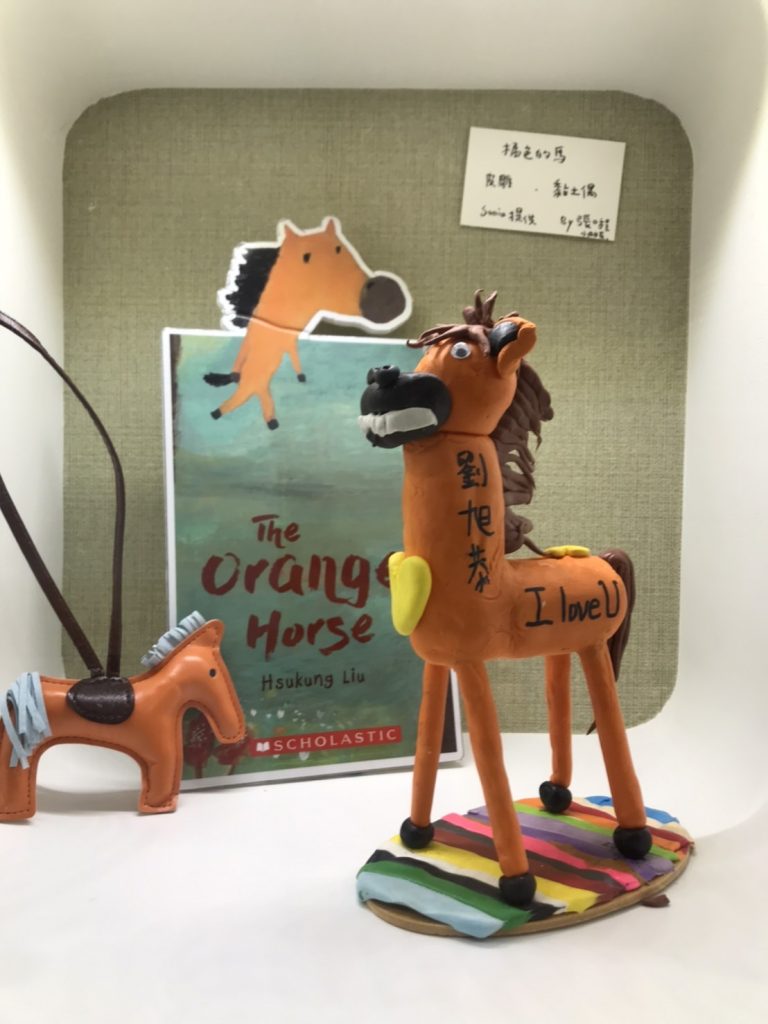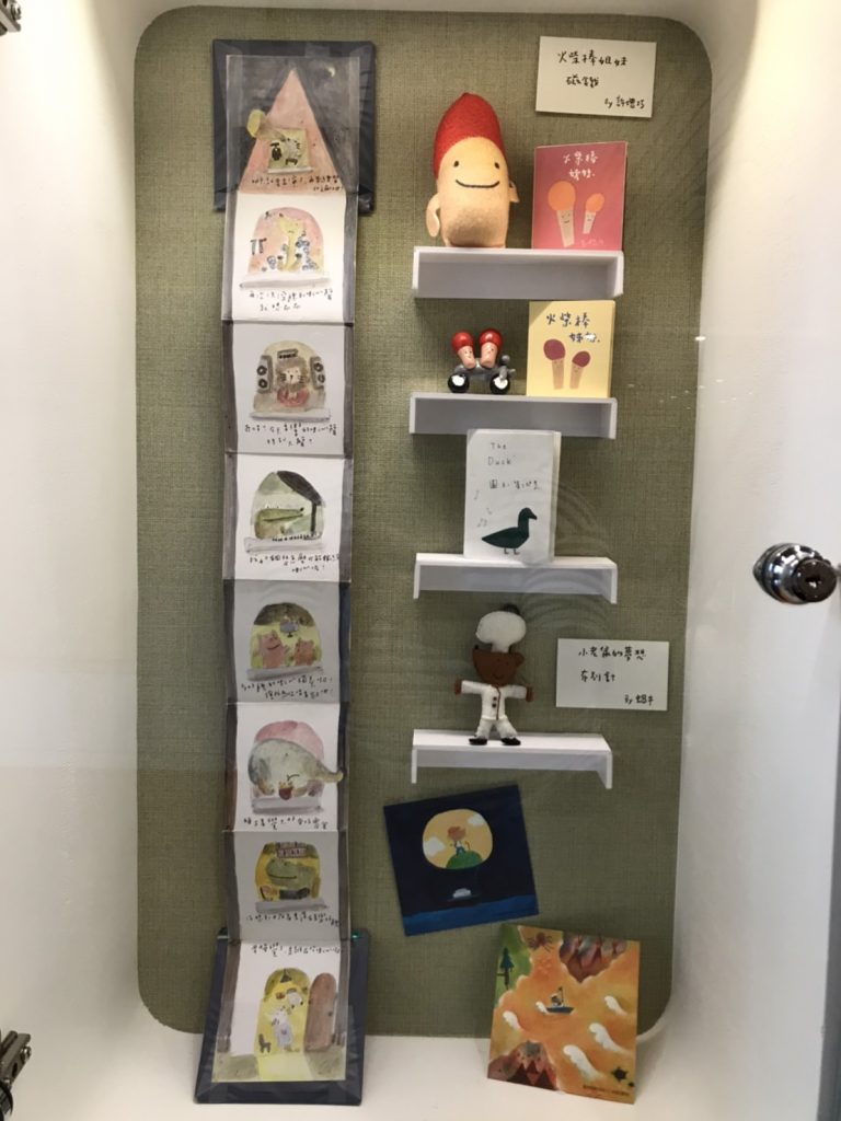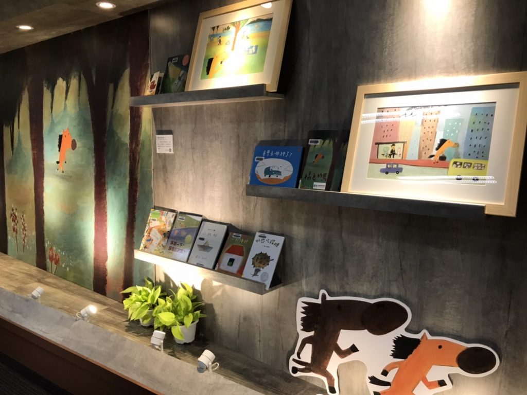 從大門口走進圖書館一樓的台灣藝文走廊,映入眼簾的是彷彿走在森林裡的閃著橘色光芒的《橘色的馬》原畫與輸出布置,電視上有劉旭恭老師細細解說,畫作旁邊還有陳列繪本讓大家可以翻閱來和原畫對照喔!牆面上可以看到許多親子耳熟能詳的繪本原畫《車票去哪裡了?》、《你看看你,把這裡弄得這麼亂!》、《請問一下,踩得到底嗎?》、《小紙船》、《一粒種籽》、《好想吃榴槤》,大家不妨靜下心細細觀察難得一見的原畫筆觸,也許再讀一遍繪本會有不一樣的感覺喔!