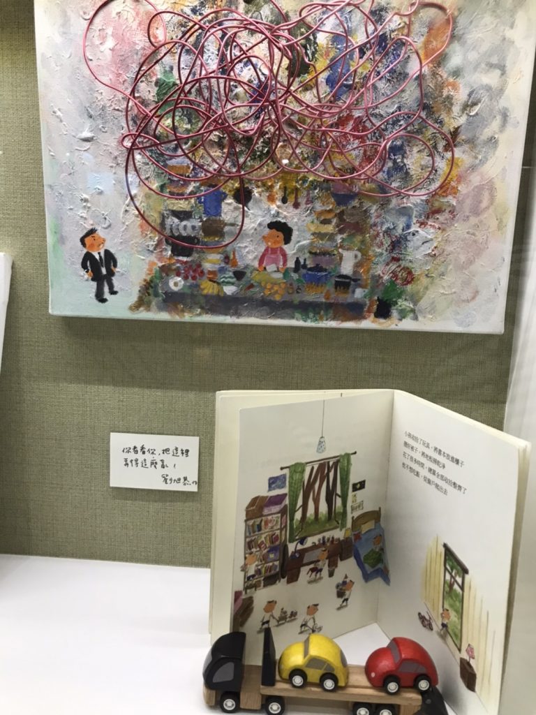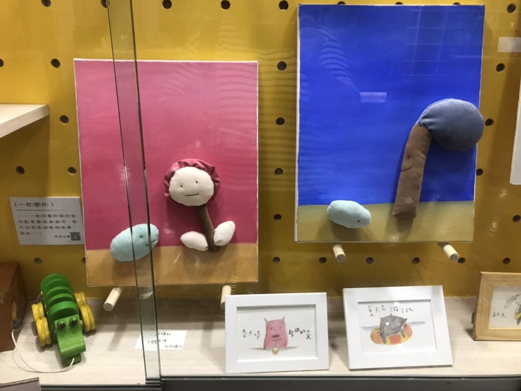 親子資料中心二樓順著樓梯走上來,就會看到一整面牆面與大小不一的小櫥窗,每個都像藏寶盒一樣,值得細細尋寶! 小典藏出版的 火柴棒姊妹的迷你小書在增巧老師巧手作成磁鐵,旁邊也有許多小書可以細細欣賞。《車票去哪裡了?》鳥巢立體創作很有柔軟舒適感。更吸睛的還有旭恭老師用油畫與鐵絲把《你看看你,把這裡弄得這麼亂!》做成的立體畫作,跟繪本有著巧妙呼應呢!