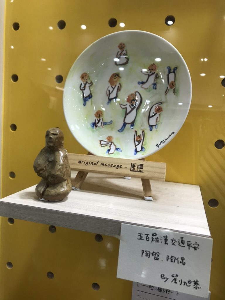 就在台灣藝文走廊走出的對面,就是改裝完成親子資料中心! 門口有劉旭恭老師為親子資料中心畫的小摺頁上的角色,來歡迎大家!入口左側會先看到疊起的數個木箱,上頭有館員細心布置的觀展指引,不妨蹲下來欣賞。入口旁有一大面的櫥窗,展示《五百羅漢交通平安》的原畫、小冊子版本以及旭恭老師做的陶盤跟陶偶,還有許增巧老師作的《一粒種籽》立體版本,以及其他繪本的延伸製作小物品,十分吸睛可愛!