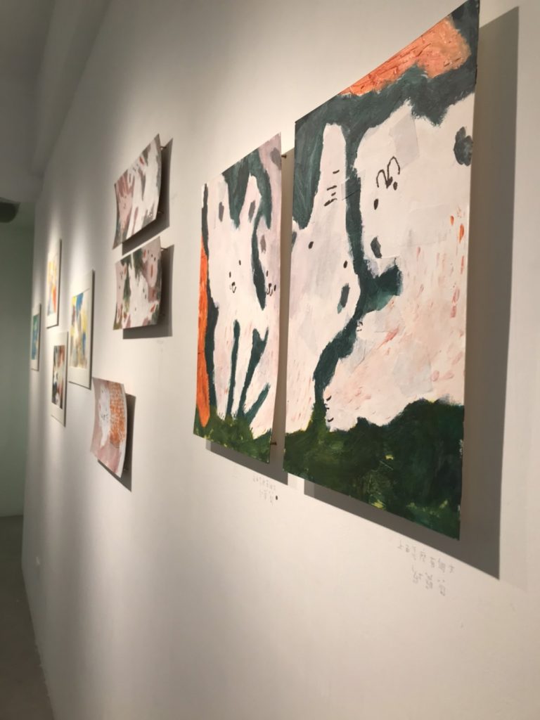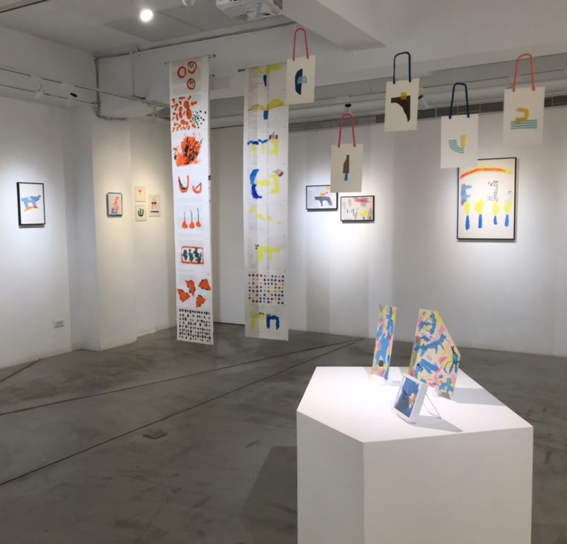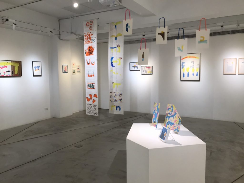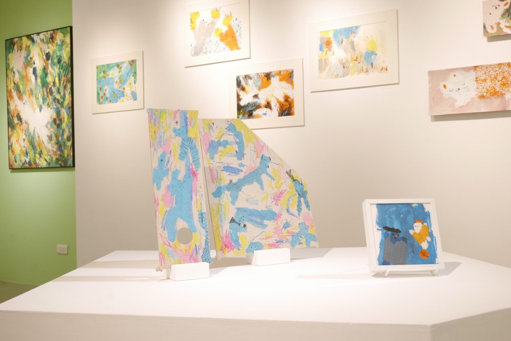 張筱琦在佈展之餘,接受小典藏簡單訪談,談到回台隔離期間,重整身心狀態後,回來之後的新創作,順應身體的直覺,畫了很多很多的「凹」。不同顏色的凹、不同方向的凹、長出了頭的凹、長出了尾巴的凹、長出了脖子的凹,自然且自由的變化著,呈現眼前的各種凹凹。因為長期使用不同紙材做創作,也累積許多創作後剩餘、各種形狀材質的小紙材,趁此機會重新又畫又剪又撕又黏,搖身一變成為新作品。