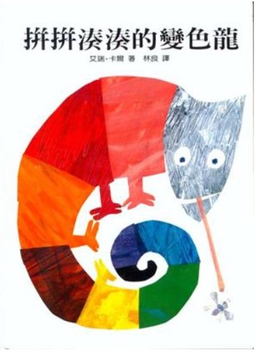 《拼拼湊湊的變色龍》(圖1) 由上誼文化出版,艾瑞卡爾所寫,色彩鮮明,內容簡單有趣。