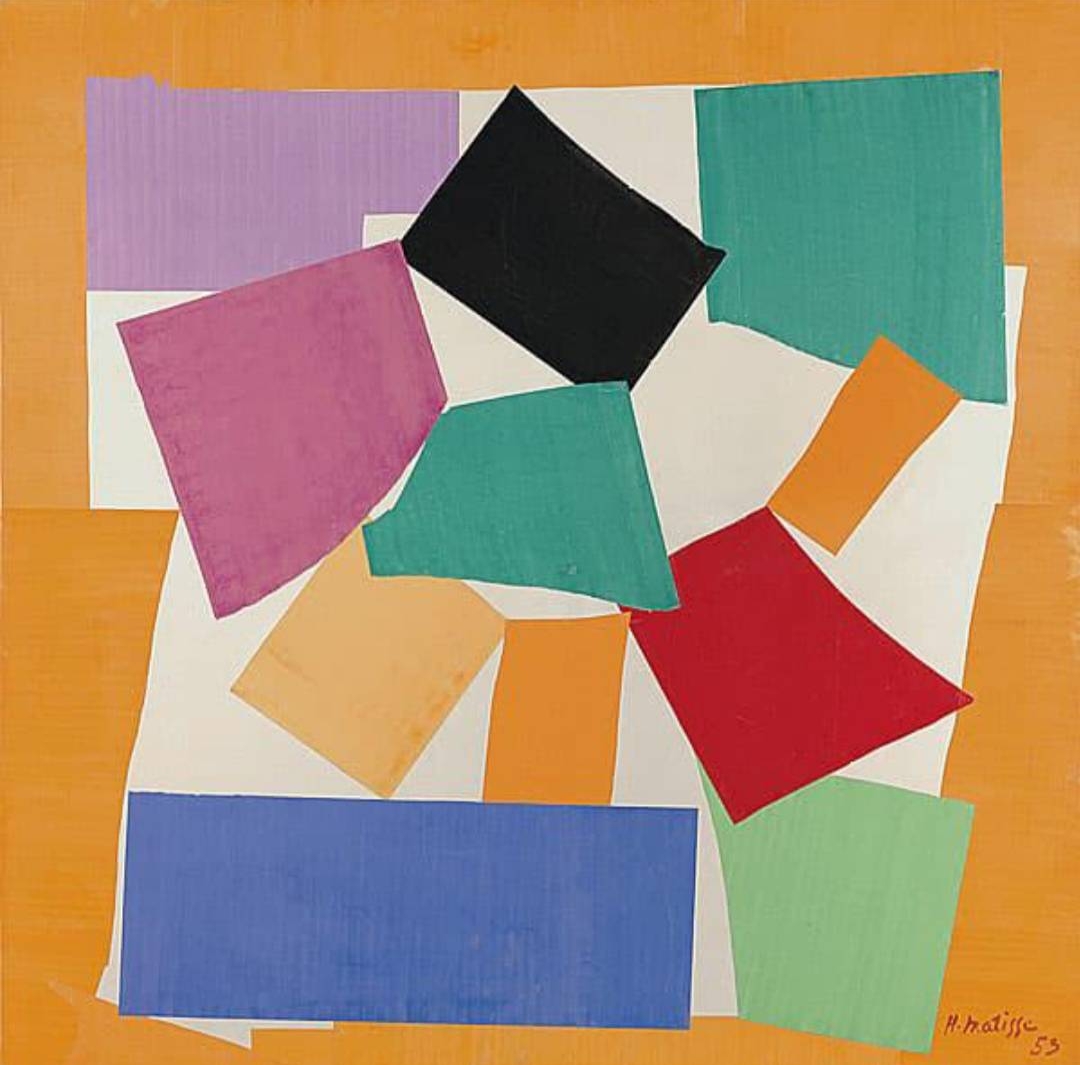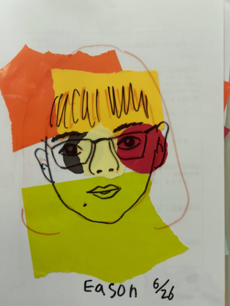 法國畫家馬諦斯在生命後期,因為生病讓他無法再從輪椅上站起來,所以他改用剪刀和彩紙,一開始似乎只是一種嘗試,但這種實驗最後卻創造了一種前所未有的風格。圖9為馬諦斯1953年創作的大尺寸《蝸牛》 (The Snail)可以說這是他抽象的作品。無意中在臉書看到,ABC 童樂繪 Art & Book Club也有一個類似的活動,利用資料夾空白的那一面,利用麥克筆描繪臉部五官,也可以畫上動物或蛋糕等線條,接著拿出各種不同顏色的色紙,或剪或撕下大色塊貼在一般的A4紙上(圖10)。完成後把貼上色塊的A4紙放入畫好的臉部資料夾即完成,發現若能利用艾瑞卡爾的色紙,應該更具藝術品性。