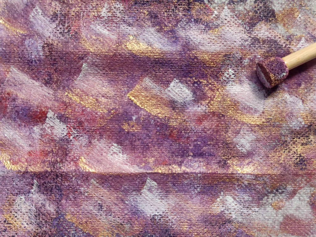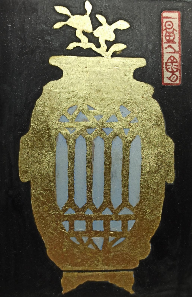 東方也有貼金泊的技巧,利用金的延展性,打出薄如紙之箔,黏貼於造像等物件的表面,貼金箔、撒金粉的技術也應運而生,日本更將其發揮到極致,〝蒔繪〞即灑金銀粉之畫,已成為日本特有的畫種。一次參加林家花園的DIY活動,畫下園內的花窗,再利用貼金箔的方式慢慢黏貼,一件貴重及帶有祝福的作品在文章最後分享給各位讀者囉(圖12)!