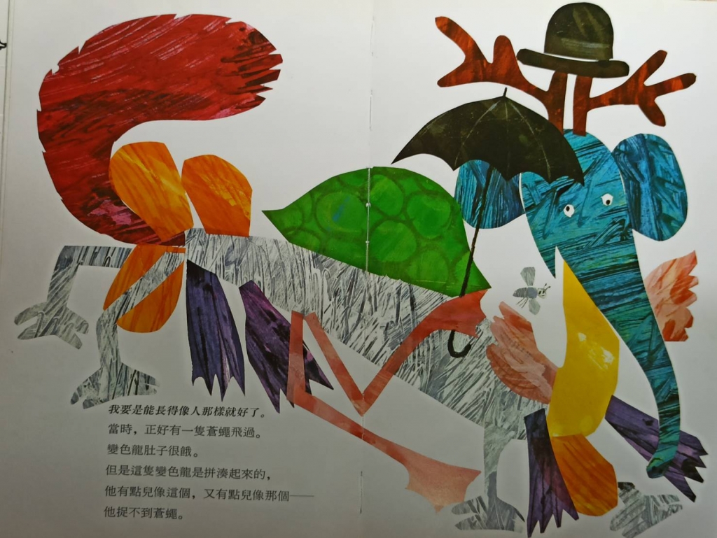 艾瑞-卡爾用他慣用的拼貼手法講述了變色龍的故事:它會抓蒼蠅,也會變換自己身上的顏色,一天,來到動物園,見到了許多漂亮的動物。這時變色龍,希望能像北極熊那樣又大又白,像漂亮的紅鶴長出一對紅色的翅膀及紅色的腳蹼,像狐狸一樣機伶而擁有了漂亮的尾巴,像魚那樣游水而有了魚鰭,像長頸鹿看得遠而有了長長的脖子,像會跑的鹿而長出了鹿角,像烏龜有了能躲的龜殼,像強壯的大象而有了藍色的腦袋,像海豹那樣有趣而擁有了蹼(圖2)。這時,正好有一隻蒼蠅飛過。變色龍肚子很餓,但是拼湊起來的變色龍捉不到蒼蠅,此時的變色龍心想要是能做我自己就好了,變色龍的心願實現了,捉到了蒼蠅的變色龍最後還是覺得做自己最好。