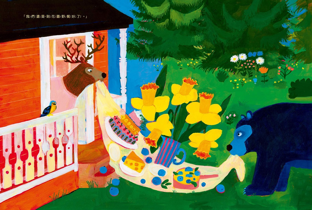 一聽就是個感覺「好好吃」的書名,一如飽滿繽紛的圖像與色彩。封面的大熊面帶微笑,雙手捧著滿滿的藍莓,噢!讀著讀著似乎有點忍不住想跟著翻開書頁、大塊朵頤一番,有誰禁得住這樣友善的邀請呢。