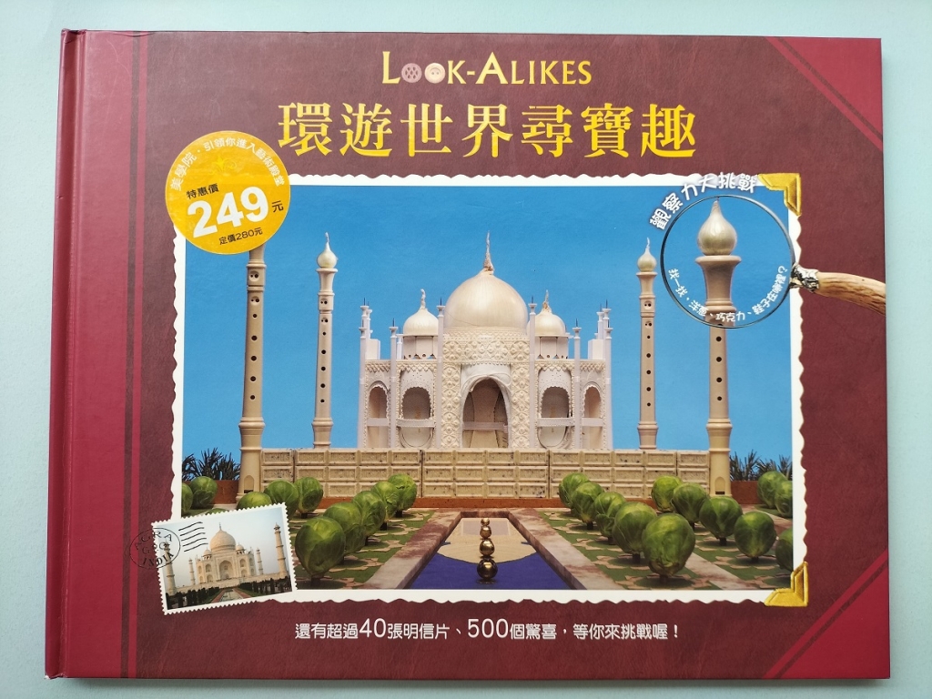 許多人視環遊世界為夢想,出門旅遊到了異地總想寄一張旅遊明信片給親友,《LOOK-ALIKES環遊世界尋寶趣》(圖12)封面圖案即是一張印度泰姬瑪哈陵建築的旅遊明信片與郵票。作者以世界各地建築、景觀等主題發揮創意,將各種生活物品如餅乾、吐司、洋蔥、鈕扣…等,以特殊拼貼藝術創造出世界知名地標,並濃縮化身於繪本內頁明信片的圖案上,讀者透過觀察,享受發現的樂趣,是集趣味、知識與藝術性的「明信片繪本」。