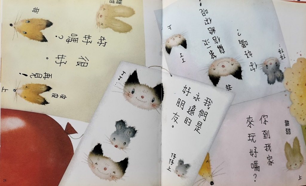 不知道你多久沒有寫明信片了?要怎麼寫呢?在《我們一起寫信》,小貓丁丁收到奶奶寄來的明信片,好朋友們見了好羨慕!原來大家都很喜歡收到信呢,於是丁丁和好朋友們決定一起來寫信,互相交換。雖然發生一段小插曲,幸好最後大家的信都成功的交換(圖14),「我們是永遠的好朋友。」「你好嗎?我很好。再見」簡單的文字表達,原來寫張明信片一點也不難!