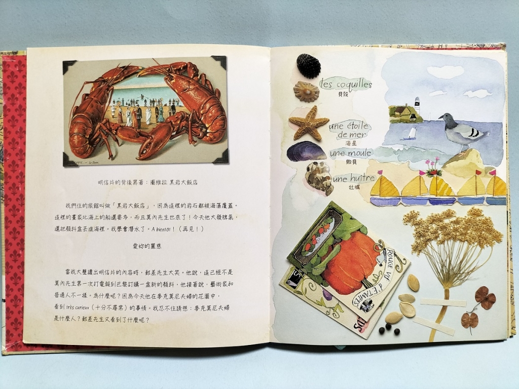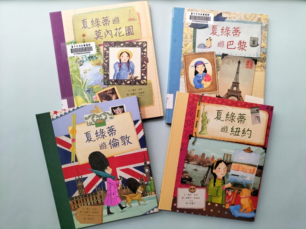 夏綠蒂藝術之旅系列在作者的創作下,無論外觀或者內頁,設計成日記本又似剪貼簿的繪本創意非常獨特,故事主要以美國女孩夏綠蒂跟隨家人移居法國、到倫敦旅遊等,以寫日記的方式記錄新生活,並將收集的明信片、照片、紙條等以拼貼、繪製小插圖等(圖16),精心完成了這四本豐富有趣的「日記本」,也帶領讀者透過夏綠蒂的日記,造訪印象畫派的時代。
