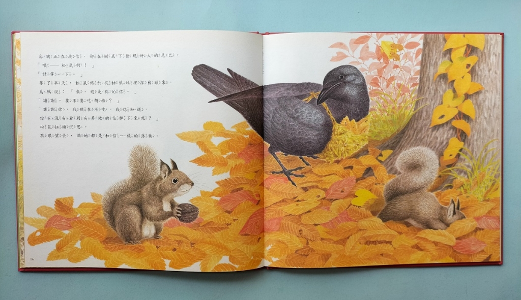 另外,還有一本關於「樹葉信」的繪本——《從山裡來的信》(圖3)。烏鴉是森林裡的郵差,受大熊委託幫忙送信給森林的動物們,信件正是一片一片的樹葉信。每一片樹葉信都用小樹枝串著,像是對折的明信片一樣,烏鴉郵差將郵袋背在胸前,很盡責的將每一封樹葉信送達。不過,有一次樹葉信意外的飛落,烏鴉詢問松鼠有沒有看到掉落的信件,松鼠扭頭沉思,很難回答,因為「放眼望去,滿地都是和信一樣的落葉。」