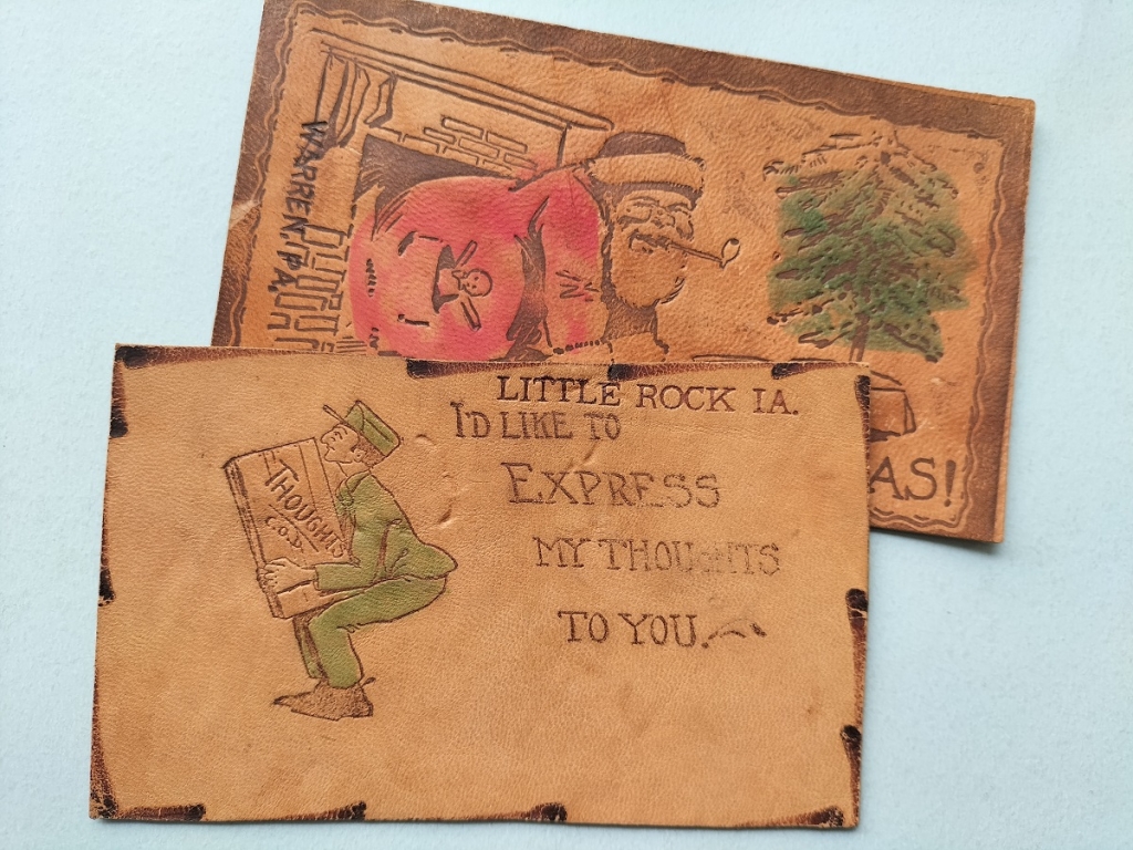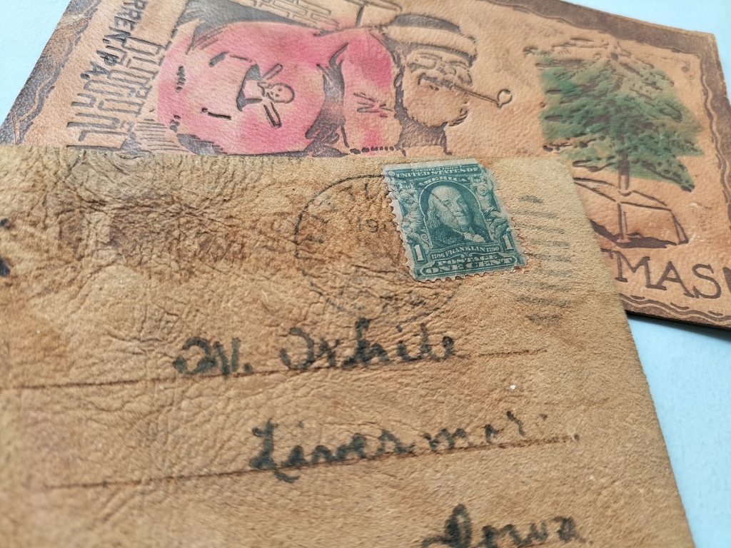 在1903年左右,大多以鹿皮製造的皮革明信片一推出後,不僅成為時尚,也引起當時人們的收集熱潮,但是皮革的粗糙材質,容易使郵票脫落,也常造成郵局分撿機的困擾,很快的郵局便在1909年禁止使用皮革明信片。