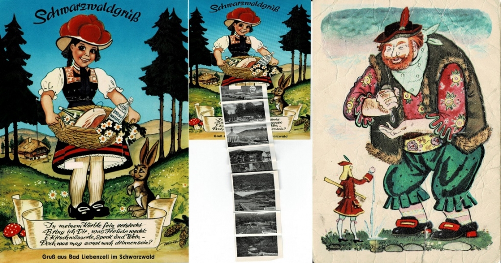 明信片上的圖畫也有著迷人的魅力,可以認識世界上另外一個國家。這張頭戴紅色絨球帽子、穿著特殊服飾的女孩(圖8),造型華麗又極為獨特。原來大絨球帽是德國黑森林當地頗具代表性的女性頭飾,竹簍裡裝著葡萄酒、培根等亦是當地特產,裙襬還有個小機關,掀開後可看到一幅幅黑森林當地景點的黑白圖片拉頁。圖右則是購自豐達雜貨馬尾古書店,俄羅斯版的格林兄弟童話故事「勇敢的裁縫」明信片(圖8)。