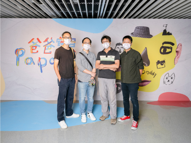 李明學(左一)、陳建榮(左二)、黃逸民(右二)及李文政(右一)同時擁有藝術家及父職的雙重身份,為桃美館《爸爸寶貝》受邀展出藝術家。