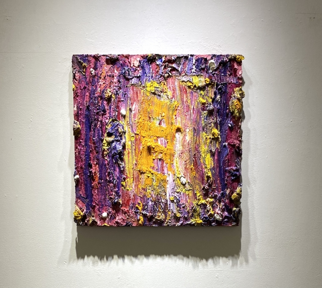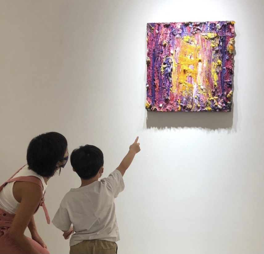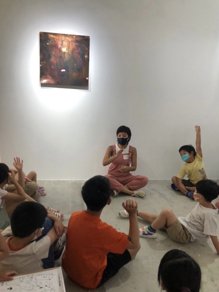 在前面提到的工作坊中,看著這件紫色中帶點黃的繪畫,我邀請孩子們觀察眼前作品激發了什麼感受、有什麼聯想,並具體指出是哪些部分讓他們有這樣的感受和想法。有孩子興奮大叫「怎麼有蝸牛跑去人家九歲生日派對!」,有孩子則平靜地說道「好像在海邊找到很多貝殼好高興~」,也有孩子在引導下娓娓說道「中間黃色的好像公車的窗戶,像是自己搭公車去上學的路上,覺得很開心!」殊不知一旁的爸爸苦笑說「你根本沒有自己搭公車上學過啊」,看來是孩子的想像力帶著他搭上了開往學校的公車,正開心地咯咯笑!