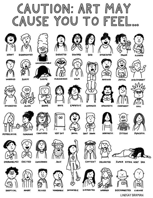 紐約現代美術館 MoMA 邀請心理諮商師兼插畫家琳賽・布拉曼(Lindsay Braman)繪製一系列情緒圖表(如下),並分享哪些 MoMA 館藏品激發她愉快、好奇、懷疑等不同情緒。五年級才第一次隨學校戶外教學踏入美術館的布拉曼,莫名受到一幅肖像畫吸引,她清楚記得當時被畫中女性的悲傷情緒捲入的感覺。她一面跟著同學繼續前進,也發現當下展現的「同理心」將她自己的悲傷也釋放了出來。即便她離開美術館後,她和畫中女性共同經歷的感受依舊深刻可及。