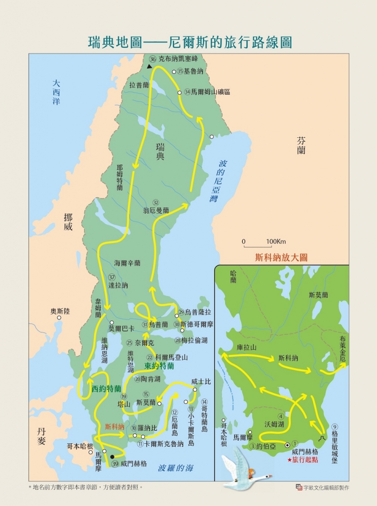 仙女給的處方箋沒有期限,只是每個年代各有不同的解讀方式。我化身為解箋人,試圖為《騎鵝歷險記》擺脫教科書的原罪,將不影響情節,過於冗長的篇章合併或刪減。再用最貼近現代的語言,凸顯尼爾斯、白鵝馬丁與奧薩三位人物的英雄之旅。此外,我們也不讓孩子憑空想像遙遠的北歐國度,貼心的附上珍貴的地圖,讓讀者按圖索驥,跟著尼爾斯環遊瑞典。