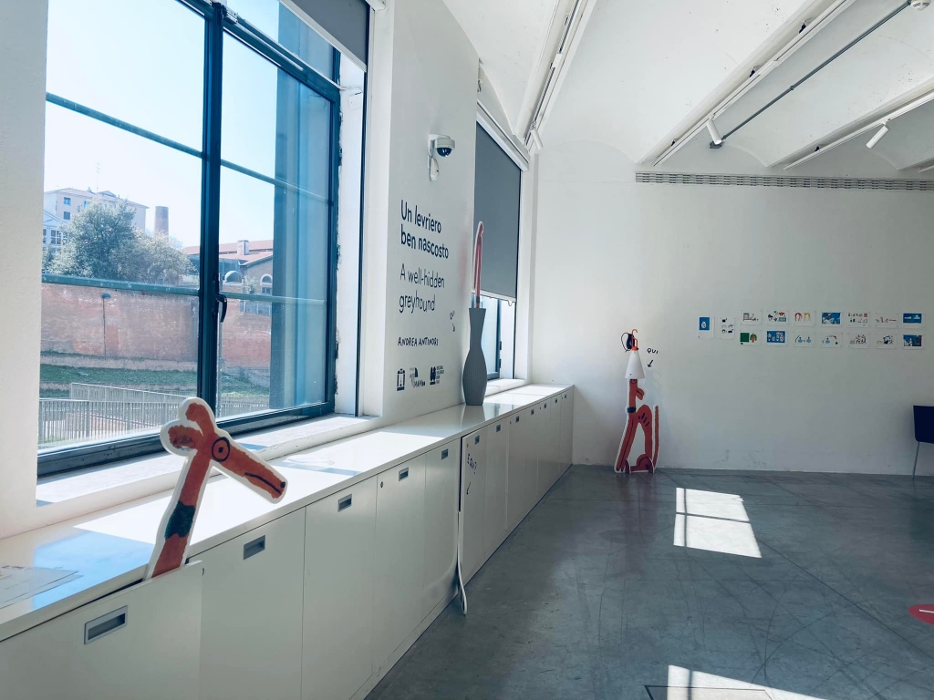 在波隆那的自由時間裡,因為同行創作者們的帶領,到處看了很多間當地的書店。在每間書店裡,都會碰到一本叫《A well-hidden greyhound》的作品,非常醒目,MAMbo波隆那現代美術館的地下室裡也進行著這本作品的原畫展。展間裡可以看到繪本的主角獵犬努力的躲藏在生活裡的各個地方,雨鞋裡、檯燈裡、花瓶裡。繪本裡提供了各種不讓總是緊張兮兮的獵犬動不動就被嚇跑的方法。