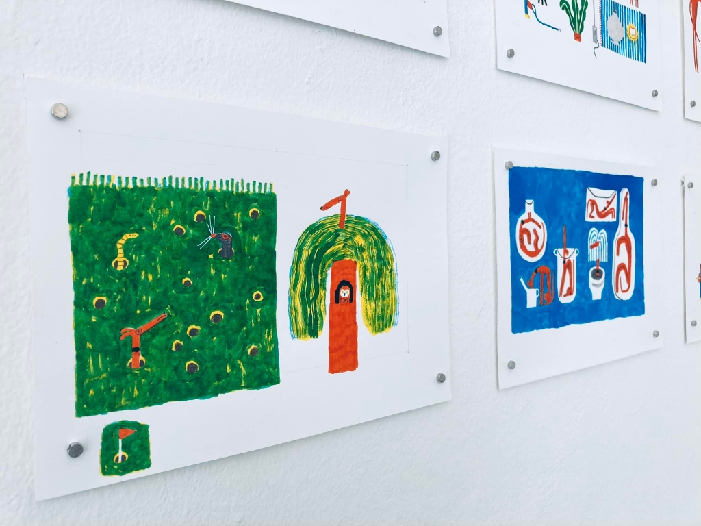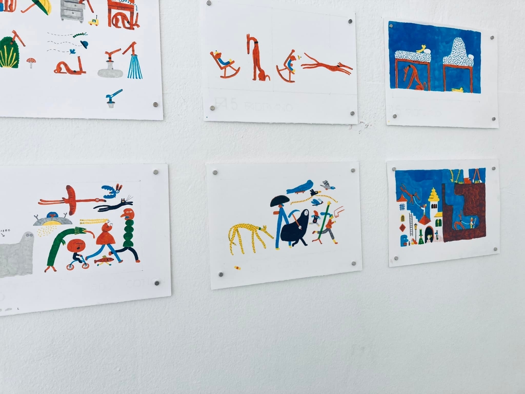 一個是Neil Packer的《One of a kind》原畫展,是一個關於歸類的簡單故事,裡面有人的分類、樂器的分類、貓的分類、工具的分類、建築的分類等等。這本繪本也是去年二〇二一年拉加茲童書獎非敘事類的獲獎作品。展場裡,每一幅原畫下面都擺了一個木頭籃子,裡面有這些物品的實物,建築分類的圖畫下面,就有一個裝滿了小塑膠建築模型的木頭籃子,是一種貼合並放大書本概念的呈現方式。因為參觀的當天,剛好是展覽開幕,人滿為患,移動不易,所以我沒有留下記錄。好奇的話,可以在Neil Packer的Instagram上找到一些展覽的記錄。