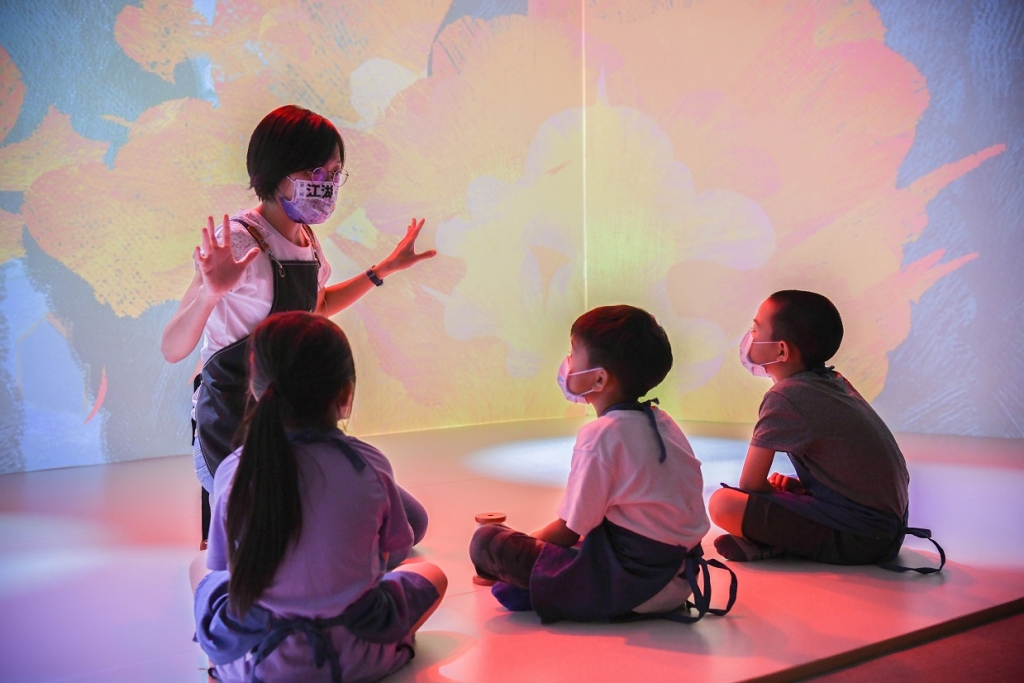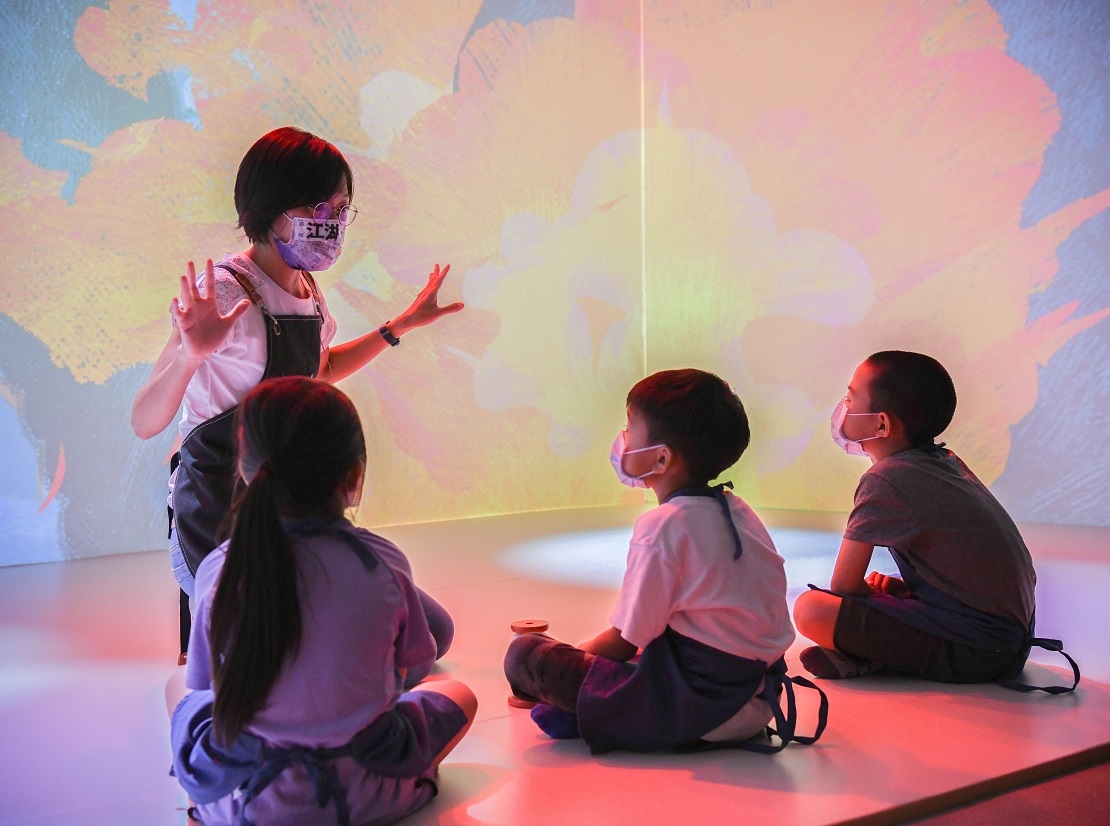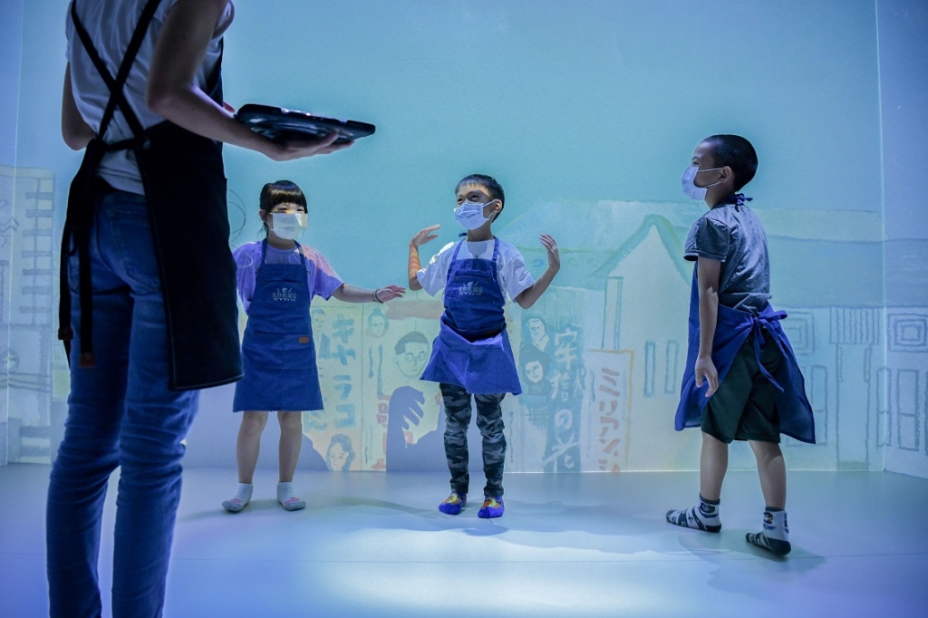 臺文館透過「兒童文學遊戲場計畫」,將館內B1的文學樂園體感遊戲區導入劇場化設計,幫助講師呼風喚雨,讓過去聆聽繪本故事的被動式,進化為同時激發五感的進行式。因應常態說故事活動,未來還將開放講師自由編輯互動腳本,配合劇情節奏,適時變換投影圖像、燈光、音樂,創造專屬故事劇場。