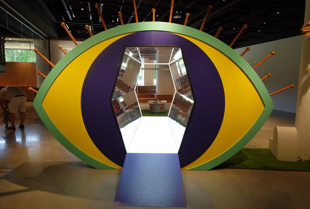 藝術家創造一幅畫,不只是把東西描繪得很像。我們看進去的景象,進入到我們的頭腦裡、心裡,會有不同的感受。超大的眼睛,可以想像自己帶著看到的感受,走進眼睛裡面體驗不同的角度,看到不同的自己,可以選選看或描繪最喜歡自己的角度。在走鏡子隧道的時候,就像回到小時候,長得很大的大朋友,記得要蜷縮著身體走進去。