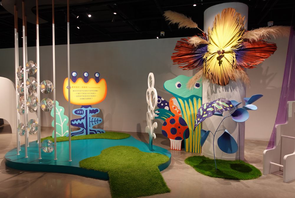 有看到什麼樣奇奇怪怪的花嗎?是平常有看過的嗎?是不是有些有眼睛,有些有奇怪的圖案?其實這邊靈感是來自於〈怪花森林〉這幅畫,所以裡面有很多奇奇怪怪、大大小小,跟平常感受都不太一樣的花朵,來看的時候可以透過放大鏡或是透鏡,你可以像是用昆蟲的複眼的感覺,或者是用前前後後來看這些世界。