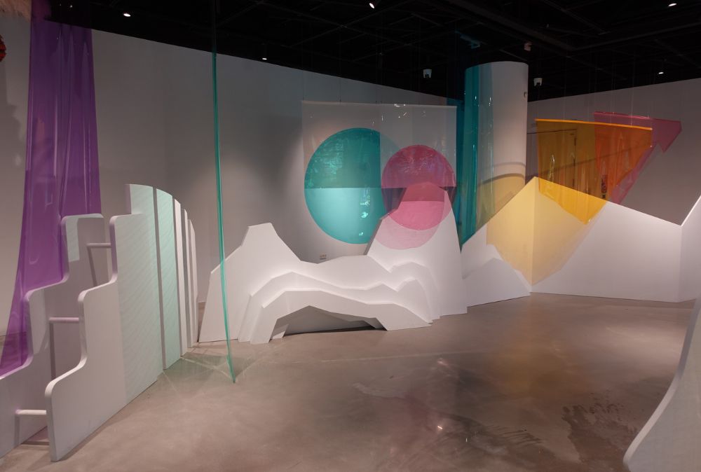 這裡有很多不同形狀的白色物體,其實都是山,是從不同藝術家的畫裡面去截取出來,為什麼他們都只有白色?有沒有看到很多透明但是是彩色的色片?透過它看的時候,山是不是就變成不同的顏色,透過想像力,從顏色重疊、顏色配搭去看,感受不同季節或時間,想想「你看到了什麼樣子的山?」或「你最喜歡什麼樣子的山?」
