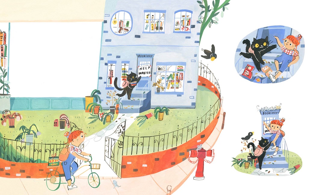 做繪本時,我也會特別設計從前面看書到後面會有些呼應,像後面有消防栓,在他剛到書店那頁時就有把它放進去,呈現小書店還沒整理好,比較凌亂的樣子,外面植物快死光,書店裡都是蜘蛛網,到後面放入隔壁小花店的小花,很茂盛,像是暗指、提示小書店的狀態跟旁邊的植物是有關聯的,這是一些在畫畫時加入的小細節。