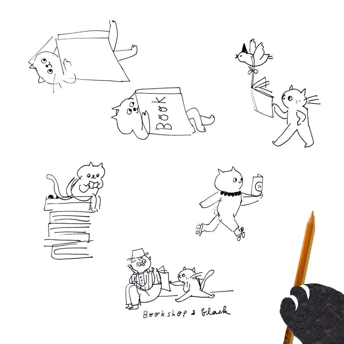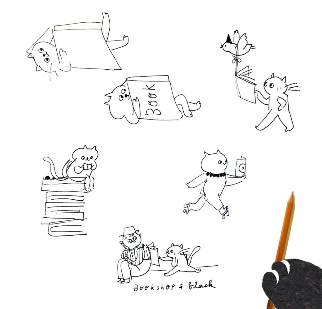 像這本書文字其實都沒有提到老鼠,但是我希望讀者在看書的時候除了文字以外有很多小細節可以去挖掘,所以裡面幾乎每面都有小老鼠出現,另外在畫這本書時我就想是不是「黑貓才生得出黑貓?」如果是這樣,書裡全部角色都會是黑貓,但是這樣也有可能會讓書店小貓沒有那麼突出,後來我上網搜尋,發現不一定要黑貓才生得出黑貓,所以我才終於可以放心地畫出不同的貓。另外像我後來才知道似乎橘貓通常是公的,很少會有母的橘貓,或是像花貓也是母的花貓為主,所以我在設計角色時,讓他的哥哥是橘貓,他的姊妹是花貓。