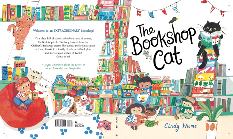 我們通常是在畫完全部裡面的書之後才去開始發想封面還有蝴蝶頁,我也是會先在本子裡畫下很多可以發展的構圖再去調整,其實本來設計師是建議蝴蝶頁刷一個顏色就好,因為書裡的圖已經太豐富了,但是因為我還是很想設計,所以後來我們的設計是前後呼應,前面的是小書店還沒有被整理過的樣子,所以大家可能會發現書的排列是比較凌亂的,還有蜘蛛網,但是後面書店小貓已經加入這個書店,所以書都排得很整齊,還有看到他的尾巴是他在幫忙打掃書店。