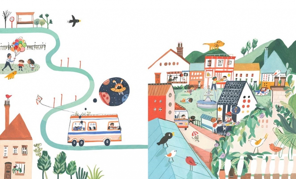 像我這本書裡他去的城市,其實我那時設計的是他在一個山上,因為那陣子我常去九份,雖然我畫的不是九份,但我很喜歡那種山中小城的故事,我想像他的車會開過很多蜿蜒小山路,再來到書店所在的地方,這是那時候加的小設定。另外這間書店的老爺爺——小薇的爺爺,這是我以前去巴黎玩的時候,剛好走路經過一間小書店,望進去看到一個老爺爺在裡面,那時候感覺蠻溫暖的,所以在畫這本書的時候,我就很想把這個角色放進去。我覺得繪本有時候他不一定是有一個很明確開始到結束製作時間,他可能是你平常很長一段時間的累積所轉化出來的。