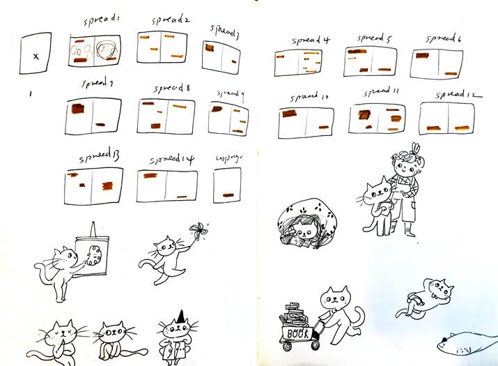 寫完故事,大致確定後,就會開始去畫裡面的圖,因為這本是和貓咪、看書有關的,所以我就會先在我的小本子裡面畫很多貓咪跟書連結的圖像,像封面這個他坐在很多書上面的那個塗鴉,就是現在速寫本裡畫的。
