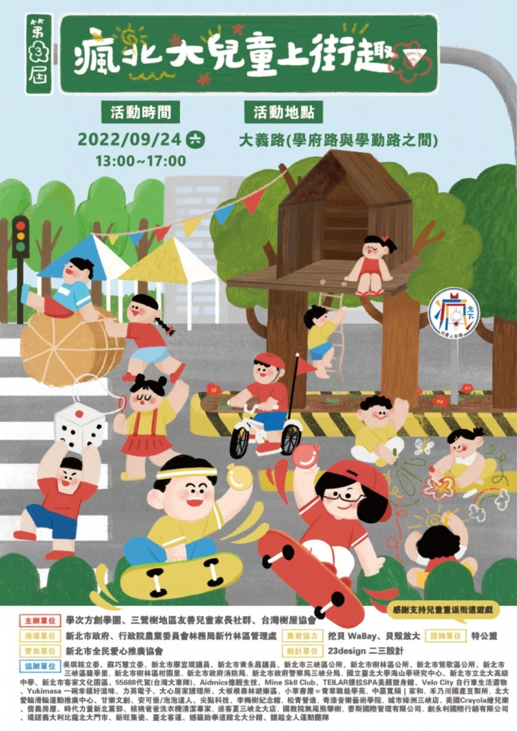因疫情睽違一年,延至 2022 年 09 月 24 日下午 13:00~17:00 恢復舉辦的第三屆【瘋北大兒童上街趣】活動,主題是「將山林帶回都市」,在新北市三峽樹林二區交界北大社區大義路中央分隔島上搭建三層樓高樹屋,在亞洲最大一萬平方公尺活動範圍內,營造森林木屑步道、大型陶土地景 以及 客運公車瘋狂彩繪等十六個遊戲主題區。