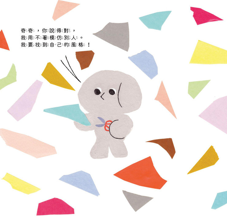 此外,夏綠蒂・梅在故事中的所形塑皮皮這位藝術家的角色,是有情緒與變化的,由最開始的自信滿滿到中間的自我懷疑、否定,故事發展到最後透過松鼠奇奇醍醐灌頂般的提點:「你得找出自己的藝術風格!」讓皮皮回歸初心找自己,這也是藝術家透過自畫像對於自己以及所在世界重新的審視。創作過程中經歷自我形象拆毀、重建,伴隨著各種情緒:得意、興奮、疑惑、焦慮、糾結、憤怒……到最後的釋懷,皆反應在皮皮的臉部表情與肢體動作上,每個翻頁仿若就是一幅行走的自畫像。也如同我們的人生,每一個當下的我,皆是獨特而珍貴的,絕對值得被深刻凝視、被記錄描繪。