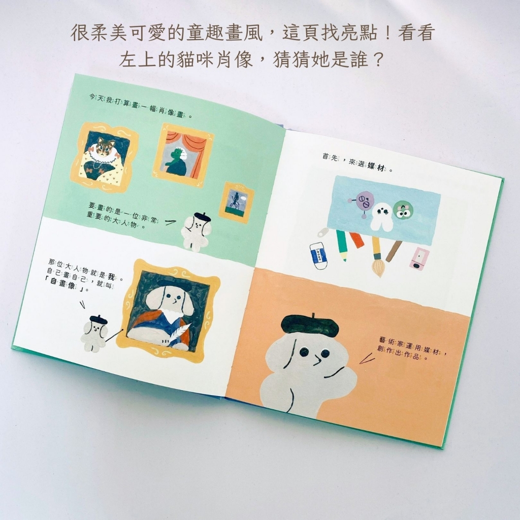 (我覺得這相當重要… 女兒一見到這本繪本就開心大叫:這個我也可以畫得出來!想想如果是看到梵谷或畢卡索的自畫像,約莫是不會有這種「我也可以」的興奮感。)