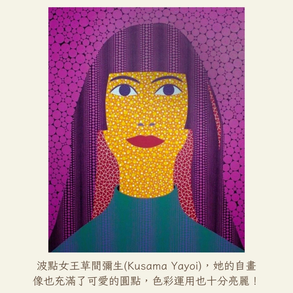 像是從立體派裡尋找靈感,或是學克里斯.歐菲利結合有趣的材料、學草間彌生用「大圓點」創作,還有以羅斯科的色域繪畫象徵生命力,這些別具特色的自畫像,都展現出他們模仿的藝術風格。
