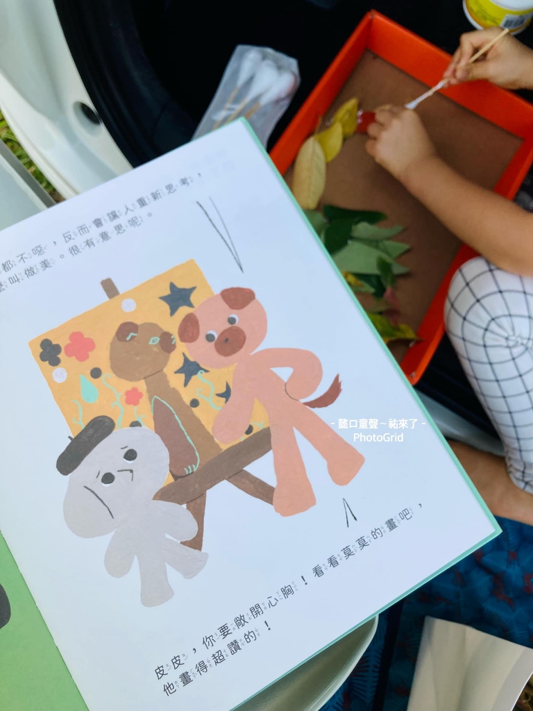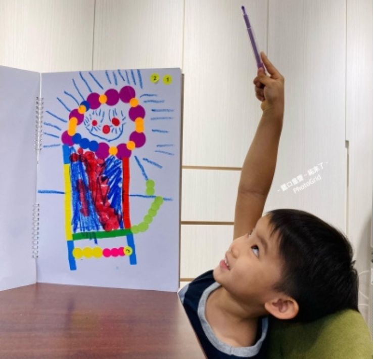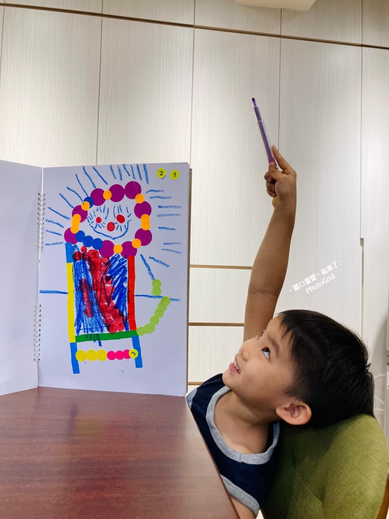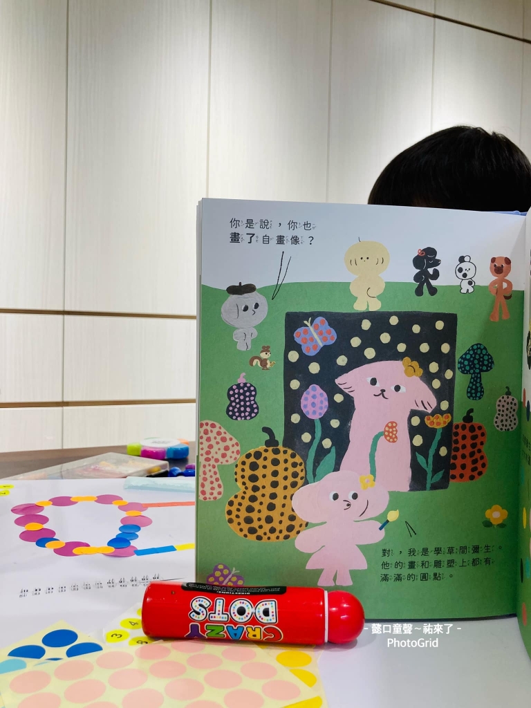 能論出媒材的多樣性可以是成就感,二寶這周以來這本書讀了不只十次,他也發現畫畫不只是拿筆畫,他可以有各種不同的形式!畫出自畫像可以是成就感,無論畫甚麼都請家長扮演好欣賞的腳色,不品頭論足。能暢談繪本裡的細節可以是成就感,坦白說這些藝術家的名字透過翻譯都變得比較饒口,但是只要幼兒願意開口聊,即使ㄧ開始只能說 「草間…」兩字,家長都可以順勢幫他們接上 「彌生」二字後繼續聊下去喔!二寶自第一次說不清楚名字,到琅琅上口,真的是繪本及共讀後座力強大!