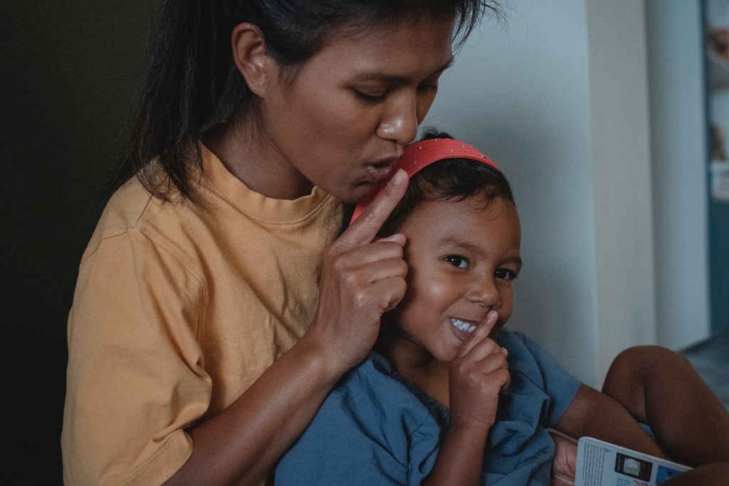 最後,某天晚上我配合她的身高蹲下來,靠近她的耳朵,用很誇張的語氣偷偷跟她說: