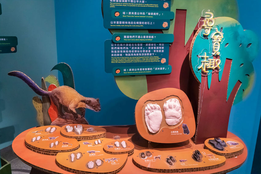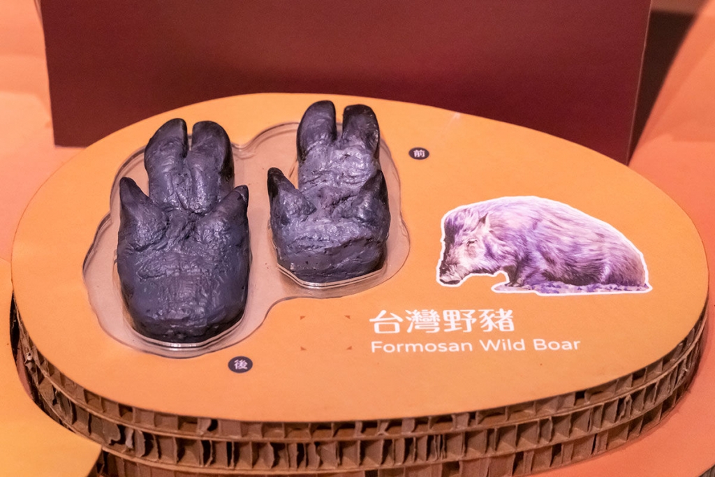 共同策展人、生物學組助理研究員陳彥君說,山林裡看似不起眼的動物腳印、排泄物可推敲動物的種類形態。例如,臺灣哺乳動物的排遺就暗藏牠們的生活食性,可分為「顆粒」、「短棍」、「長條」,草食動物多半是顆粒狀,肉食動物細長條狀。