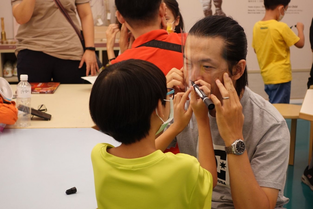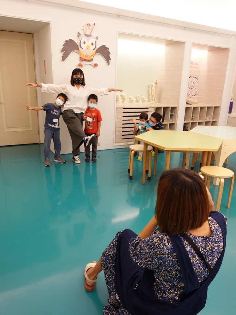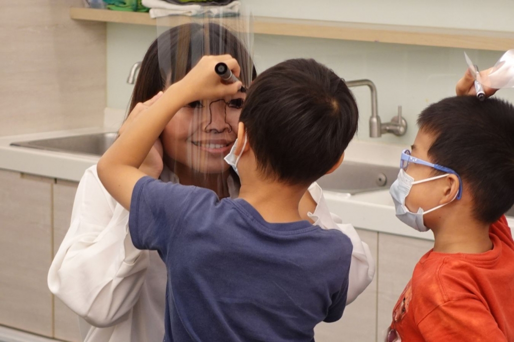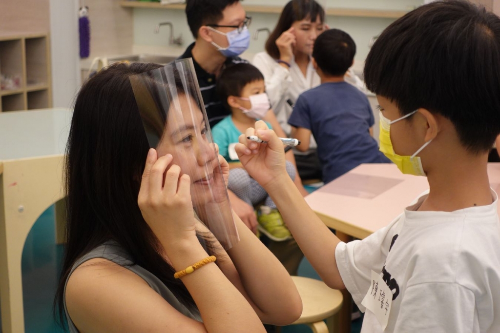 體會了肢體暖身,所謂的擺POSE不是那麼容易的事情,接著在臉上放透明片,讓親子互相描繪五官!
