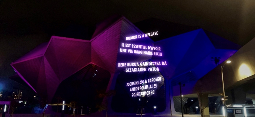 畢爾包古根漢術館是一間展示當代藝術的美術館,戶外展區除了有精采的大型裝置藝術外,室內的展區也很精彩喔!首先進入一樓的101展間時,可以看到九個從地板直立至天花板的雙面LED面板,每個面板都超過12公尺,當紅色、藍色的文字不斷在跑、閃爍時,你除了接收到許多訊息外,是不是也感受到一種氣勢磅礡的感覺呢?《INSTALLATION FOR BILBAO》是由美國藝術家珍妮.侯哲爾(Jenny Holzer)所作,她常將自己的思考用語言的形式記錄下來,或擷取經典文學、政府文件中的文字,利用LED投影等技術,以文字的力量,探討各類主題。