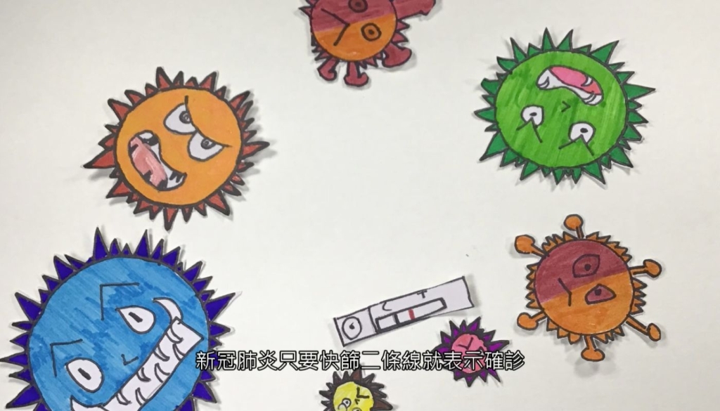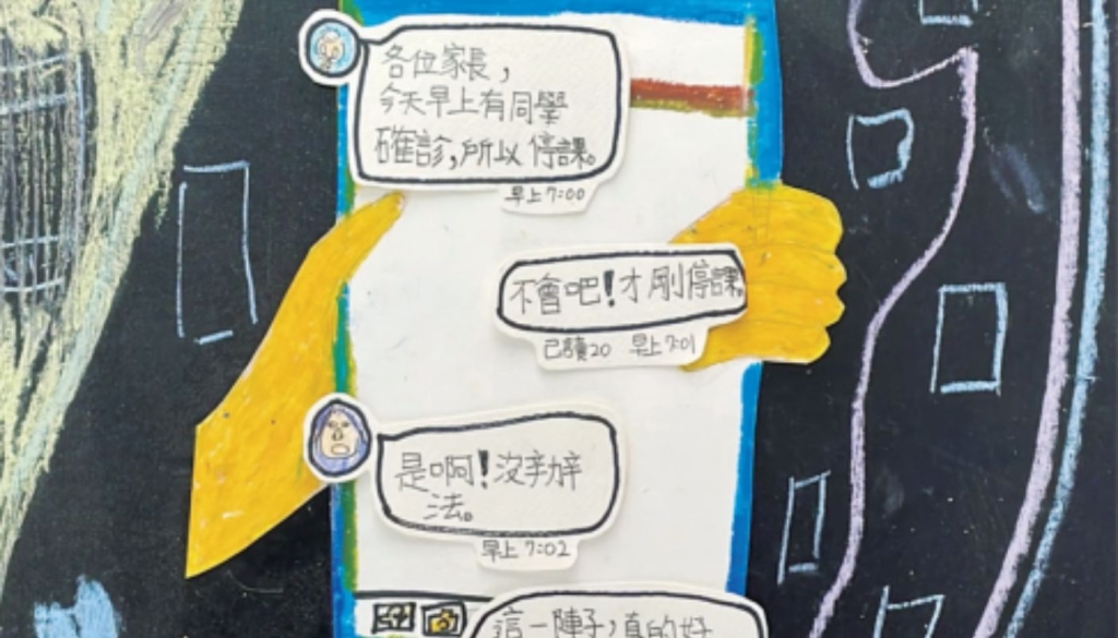 台東加拿國小則以確診的《二條線》,聯想生活中處處可見的兩條線,驗孕棒、馬路分隔線,到快篩確診,染疫心境躍然紙上,令人莞爾。